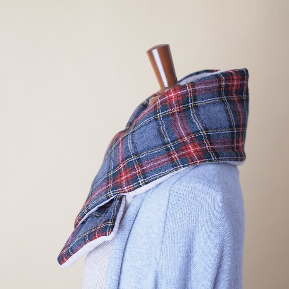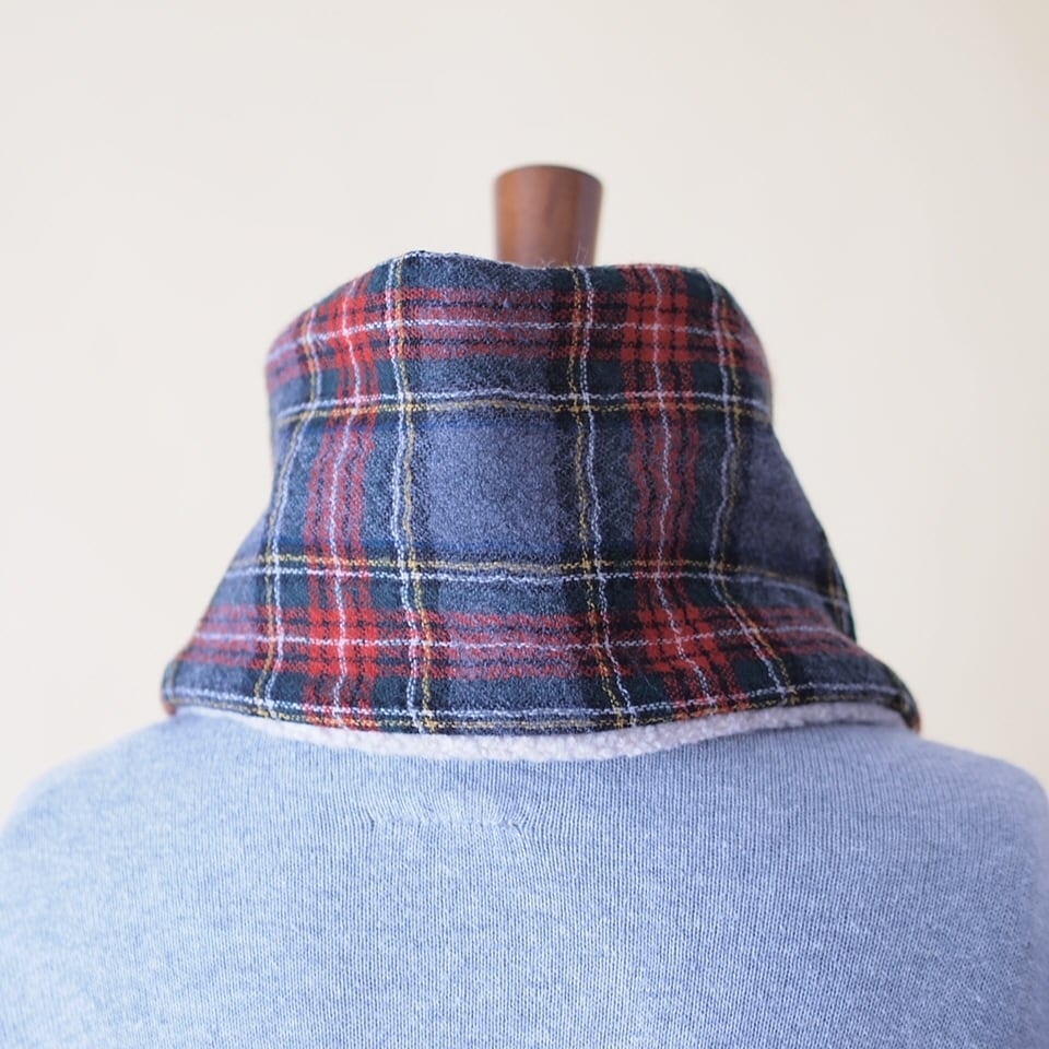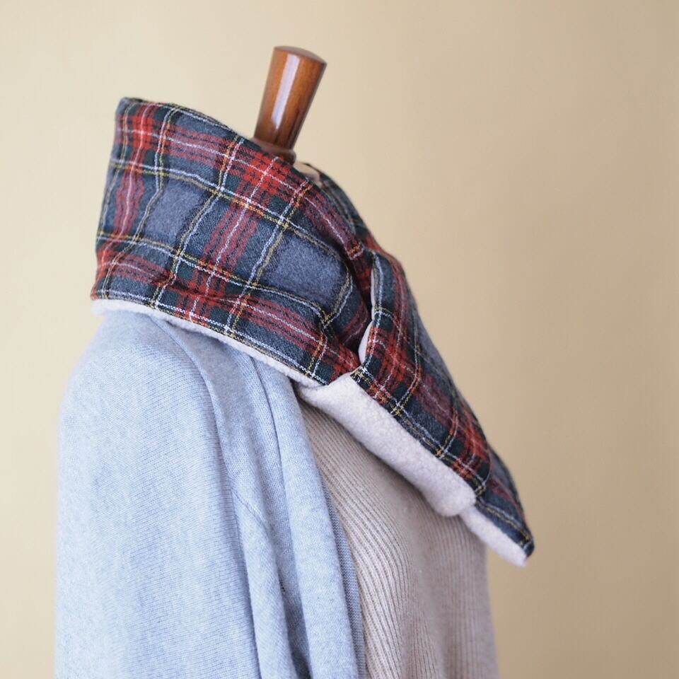 中綿入りでふっくらさせていますのでフィット感もあって暖かです。端っこのわっかに差し込んでササッと簡単に巻いていただけます。