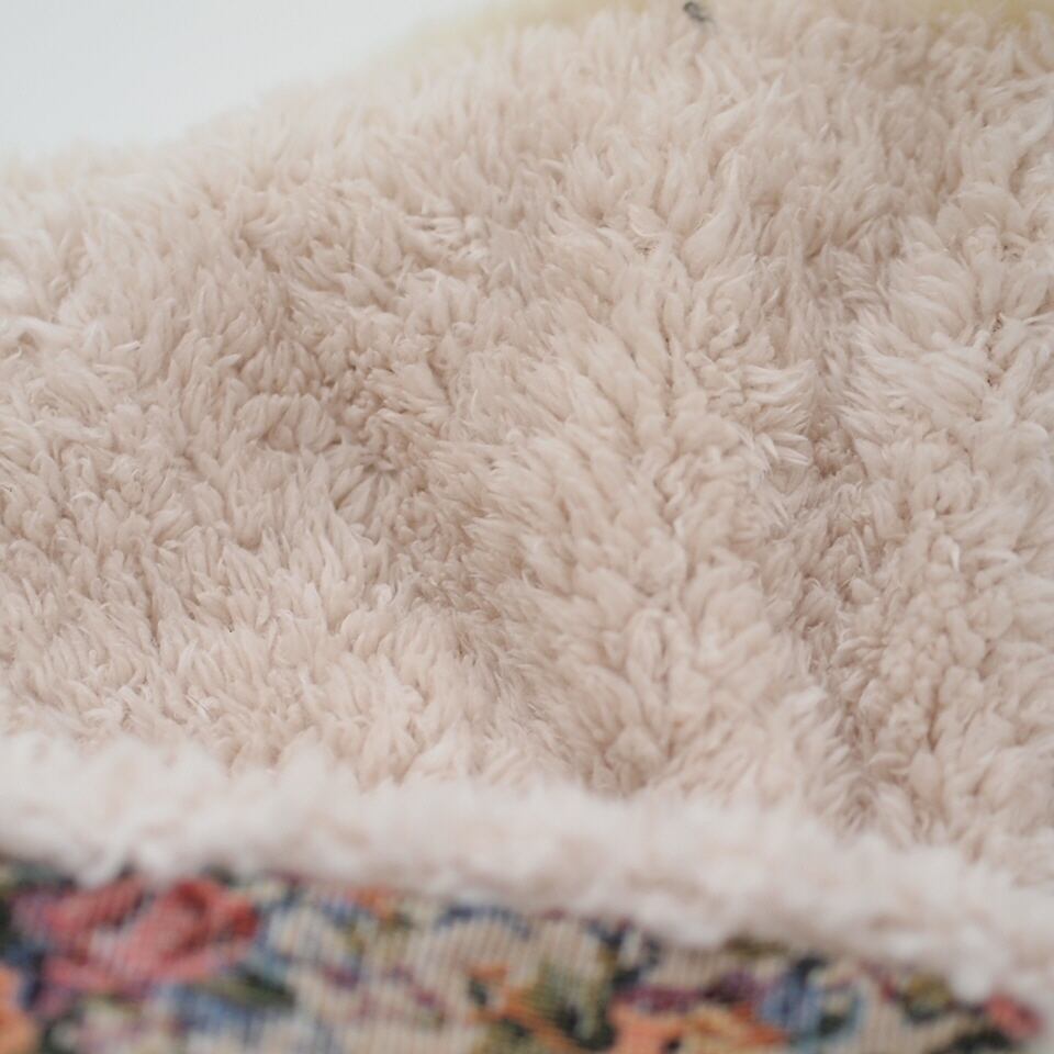 上品な花柄のゴブラン調の生地ととても柔らかくふわふわでずっと触っていたくなるような上質なエコファーをあわせています。内側には肌ざわりのよいボアを使用しています。