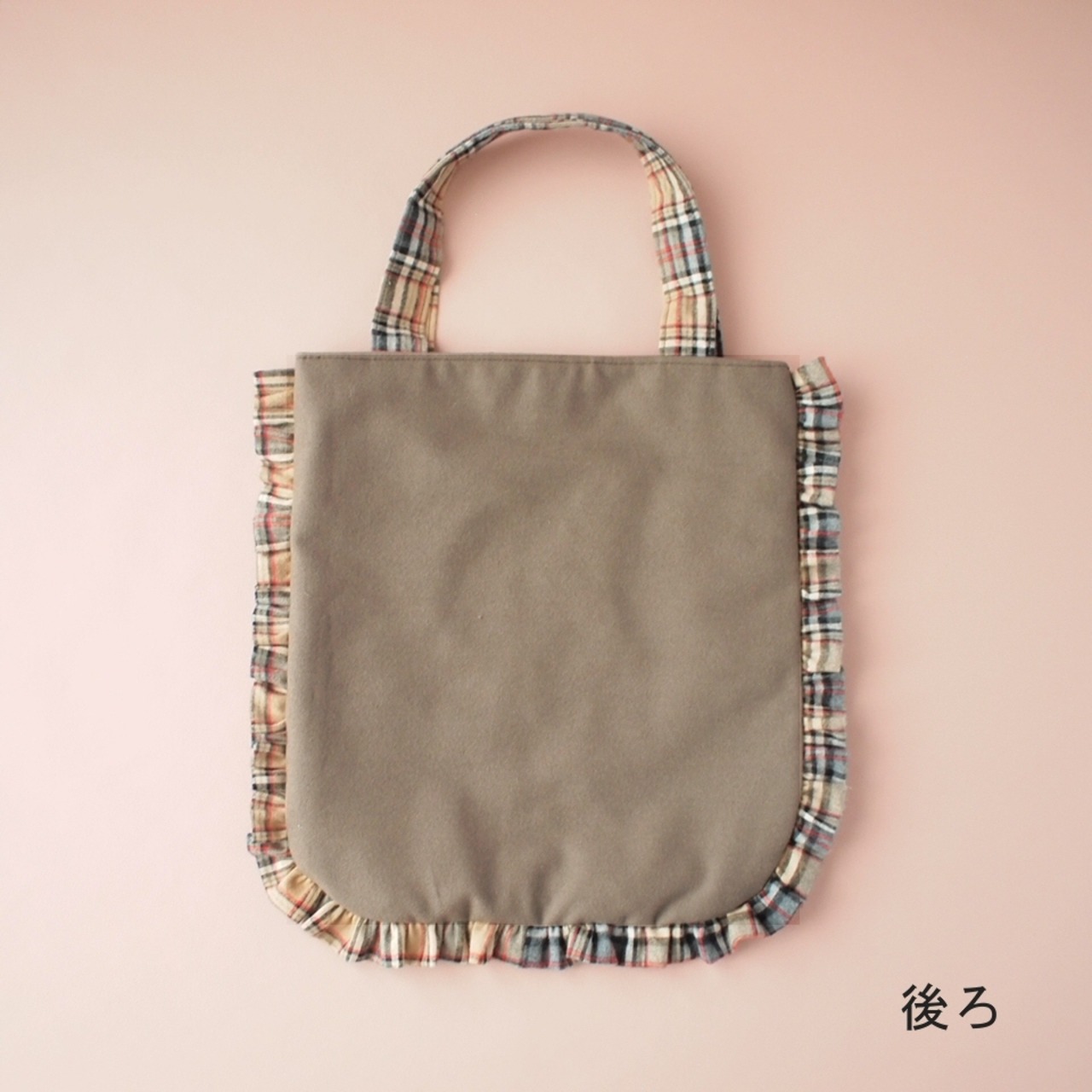 後ろはふんわり起毛でやさしいブラウンカラーのフランネル、フリルのチェックは赤いラインが入っていて暗くなりがちなブラウンカラーのアクセントとなっています。A4サイズもすっぽり収まります