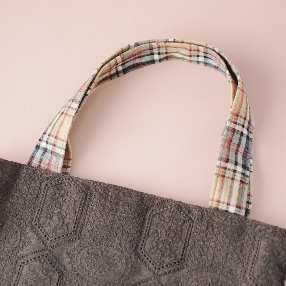ありそうでなさそうなコーデュロイ・レースファブリックにチェックのフリルをつけて冬のコーデのアクセントになるバッグをつくりました